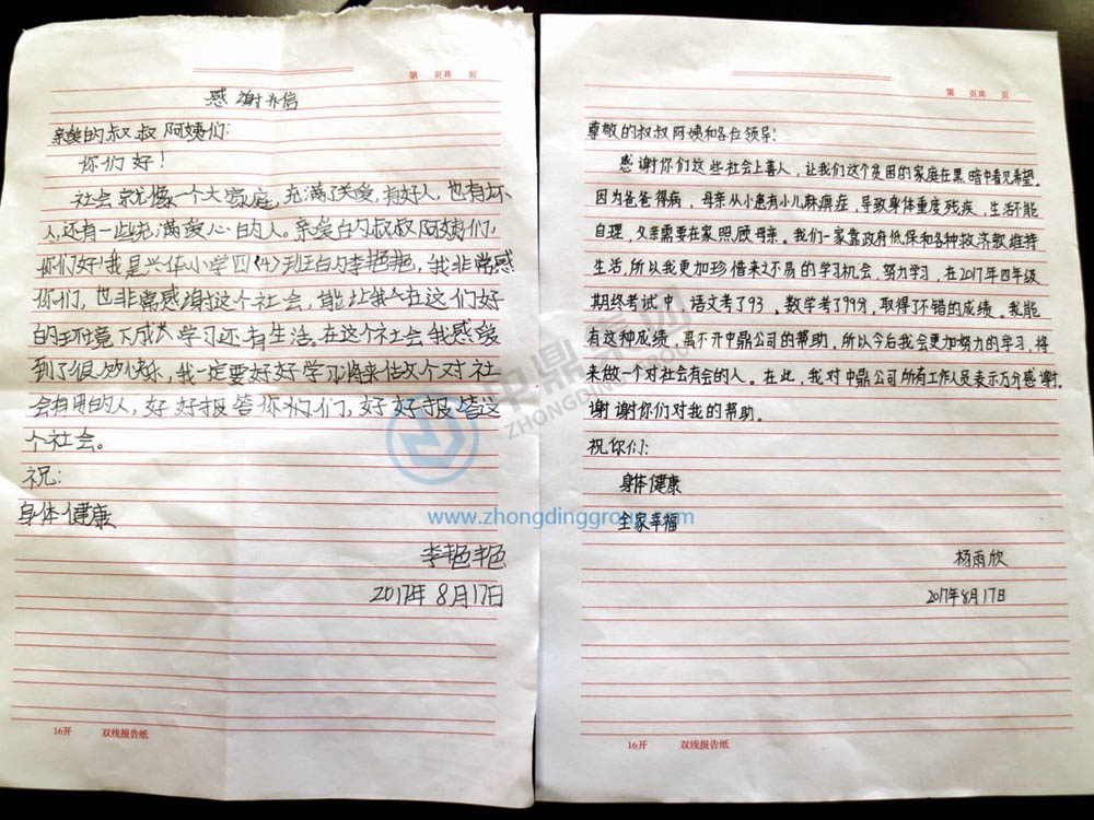 “尊敬的叔叔、阿姨,感谢你们这些社会上的善人,让我们这个贫困的家庭在黑暗中看见希望……”。8月17日,中鼎精工广德分公司收到两封特别来信,这是由公司资助的两名女孩送给“好心的叔叔阿姨”的感谢信。