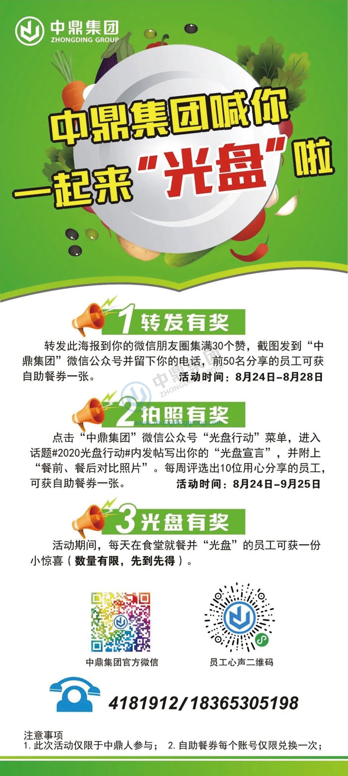 为迅速营造活动氛围,强化宣传效果,集团工会联合生活服务公司,策划开展了“品尝舌尖上的美味,拒绝舌尖上的浪费”活动,利用中鼎官微宣传造势,通过“拍照有奖”“光盘有奖”“转发有奖”的奖项设置,鼓励广大员工积极参与“光盘行动”。同时,为配合活动开展,团委还安排志愿者担任劝导员,引导员工文明就餐,减少浪费。此举立即掀起“光盘”热潮,据生活服务公司初步统计,自活动开展以来,每天收集的泔水较前期减少了三分之二。另据相关预计,若坚持一年,公司宁国境内四个食堂一年可节约30000斤大米。