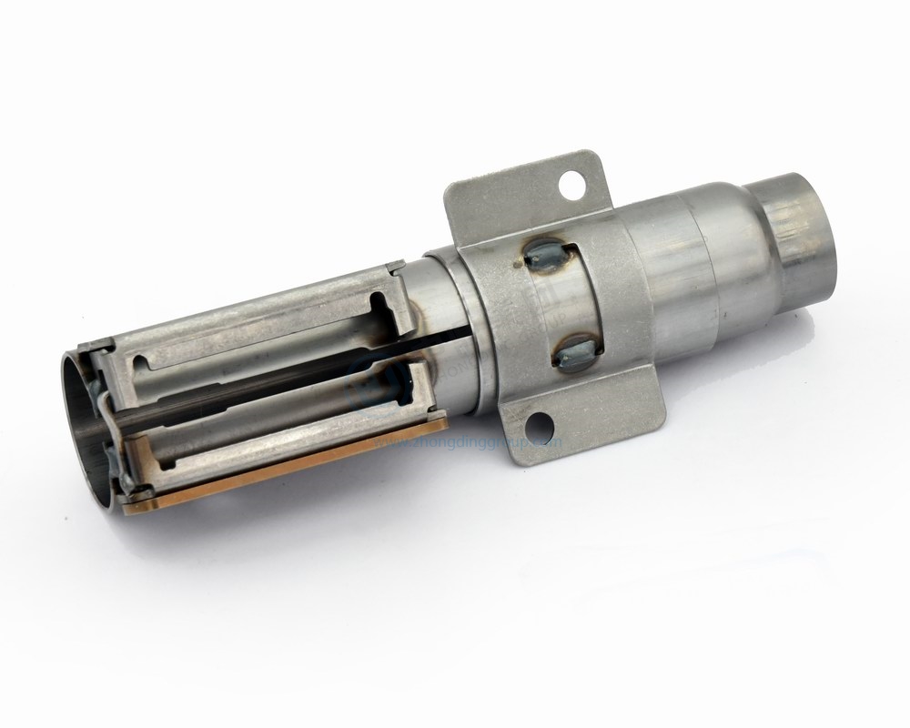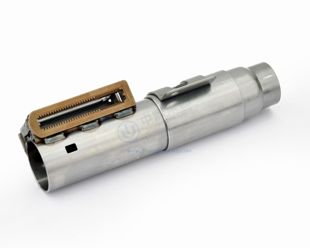 该产品是电子转向外套管,具有锁孔安装和方向盘高低、角度调节的作用。核心部件采用粉末冶金技术加工,保证了调节齿板的高精度。采用全套德国进口生产线进行加工和组装,自动缩口设备、自动焊接机器人,一体化的焊接工装,提高质量的同时也加快了生产节奏。
