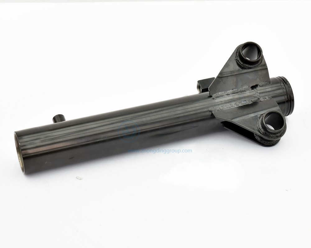 该产品是液压转向油缸部件,采用可编程的自动液压冲孔机,由内而外冲孔,确保钢管内壁无毛刺,采用可编程自动焊接机焊接油嘴,确保焊接高效、稳定与准确,采用进口MAG焊接机器人进行支架焊接,提高焊接效率与精度。